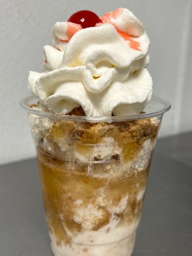Your choice of our delicious Ice Creams, layered with Spiced Apples and Streusel! Topped with Whipped Cream and a Cherry