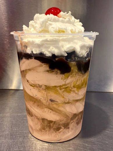 Your choice of 3 of our delicious Ice Creams, layered with 3 Toppings of your choice, in a Quart Container! Topped with Whipped Cream and a Cherry