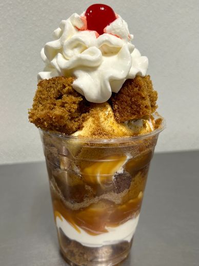 Your choice of our delicious Ice Creams, layered with Hot Caramel, Pumpkin Bread, and Spiced Wafers! Topped with Whipped Cream and a Cherry