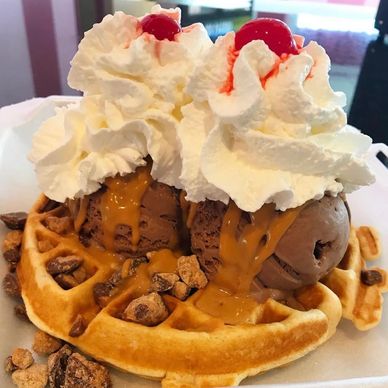 Your choice of 2 of our delicious Ice Creams, topped with 2 Toppings of your choice! Topped with Whipped Cream and a Cherry