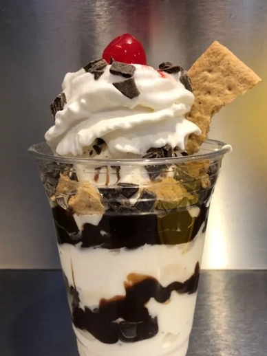 Your choice of our delicious Ice Creams, layered with Hot Fudge, Marshmallow Sauce, Chocolate Chunks, and Crushed Graham Crackers! Topped with Whipped Cream and a Cherry